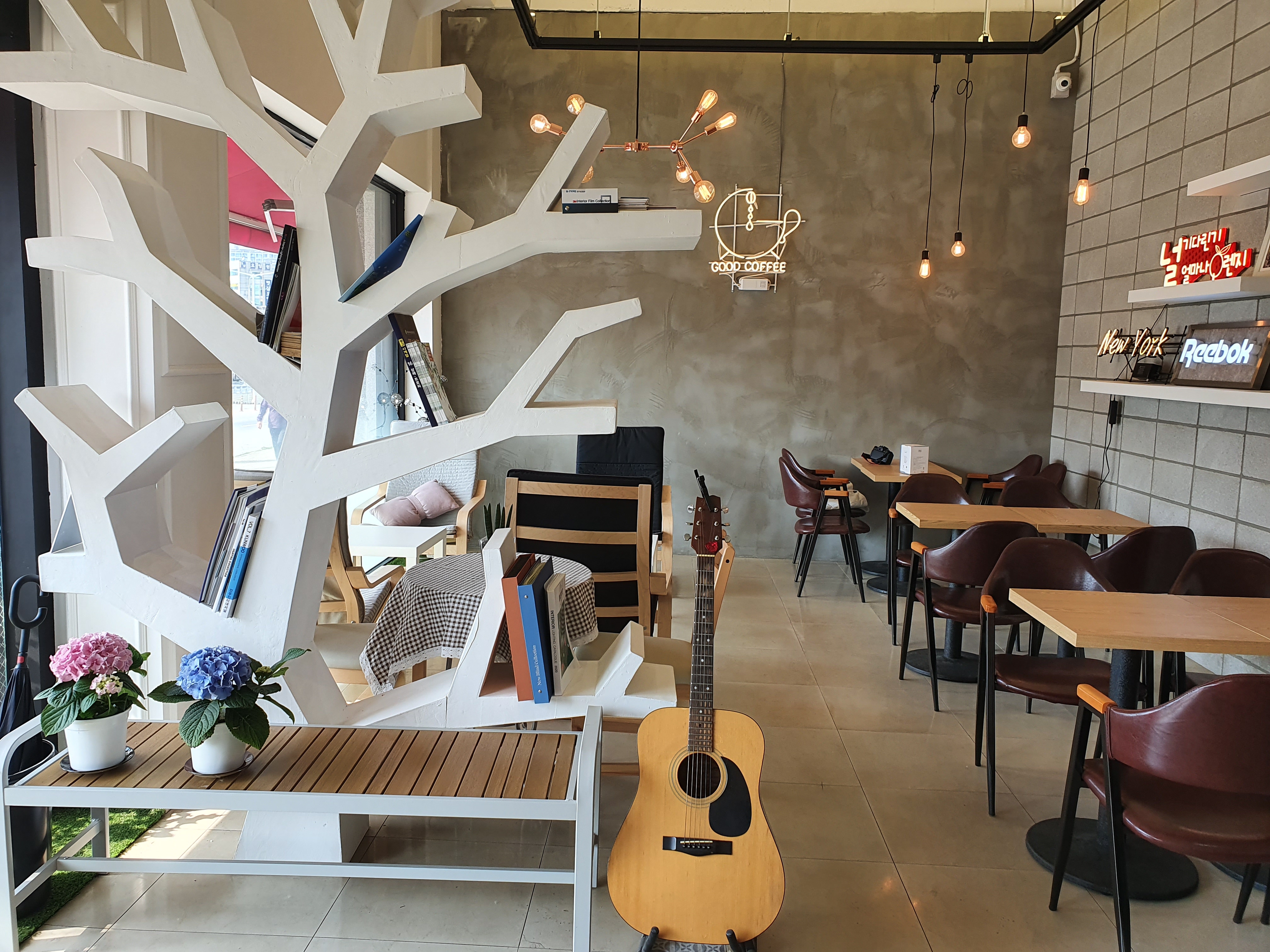 또한 이 곳에 올 때마다 기분이 좋은 이유는 사장님이 참 친절하십니다. 어디를 가든 사람이 좋으면 더 기분이 좋아지는 것은 당연한 이치지요. 아무리 좋고 쾌적한 카페라도 불친절한 직원이 있는 곳은 다시 찾고 싶지 않아지니까요. 예쁜 기타와, 나무 책꽂이가 있는 카페에 앉아 저는 따듯한 아메리카노와 아이스 아메리카노를 주문했습니다.
